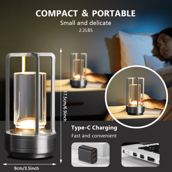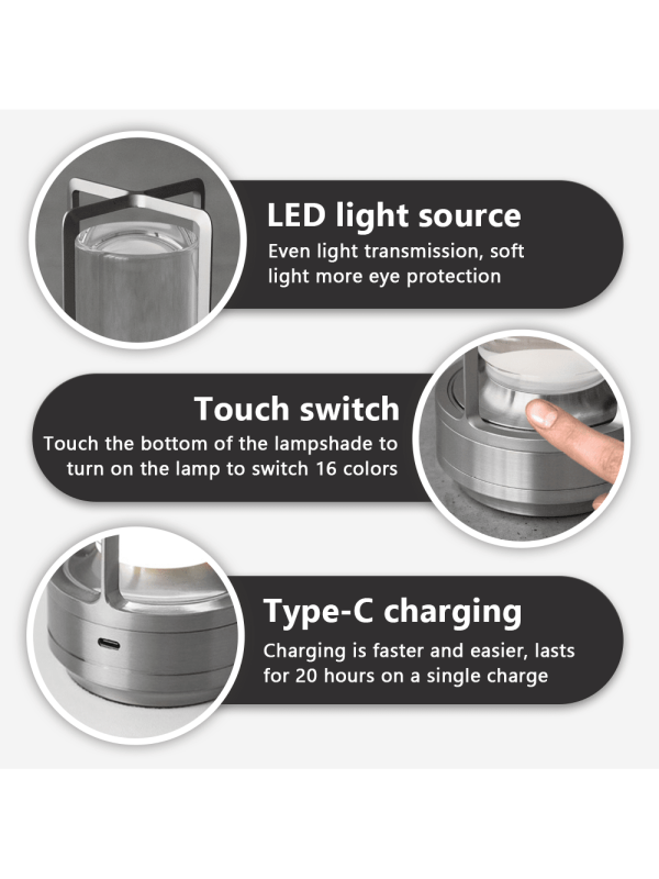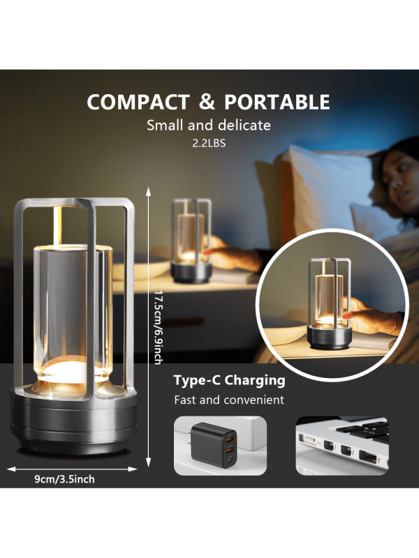 This single-pack silver portable metal desk lamp combines style and practicality. Featuring a cordless LED design, it??s easy to move between rooms while maintaining its contemporary charm. The touch-sensitive controls allow you to switch between three brightness settings to suit any need??whether for reading, working, or creating a cozy evening atmosphere. The rechargeable battery ensures hours of uninterrupted use, making it perfect for bedside tables, office desks, or decorative purposes. Its versatile functionality and sophisticated silver finish make it an excellent addition to modern living spaces.