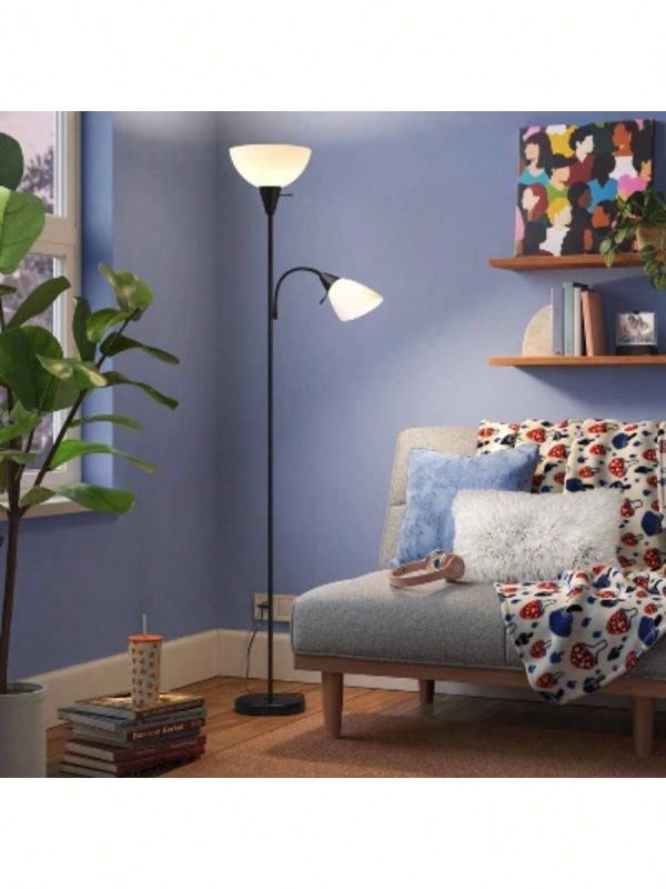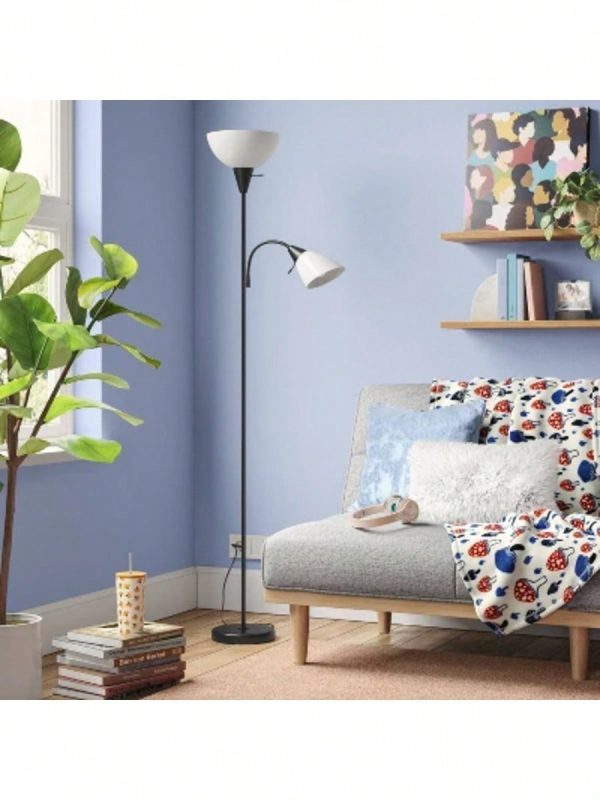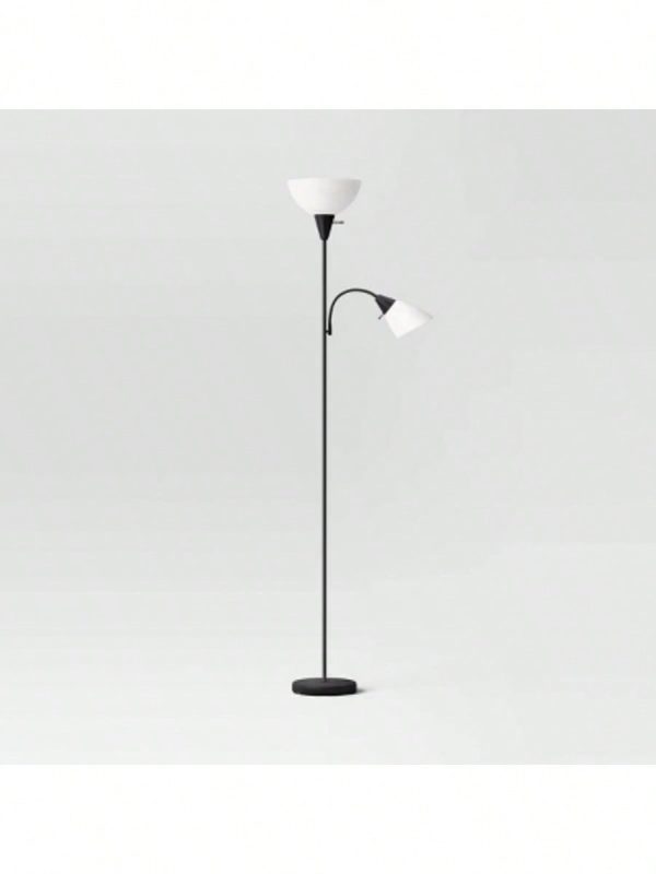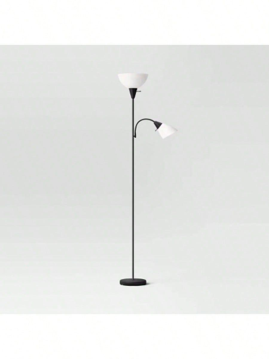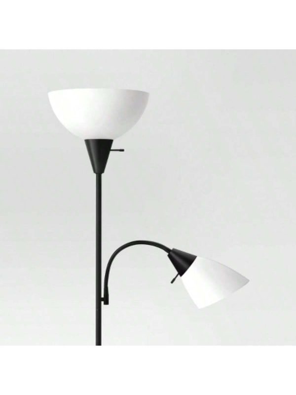 This torchiere floor lamp is perfect for spaces that need both ambient and task lighting. Featuring a clean black finish, the lamp offers a minimalist design that suits any modern room. The upper torchiere light provides ambient light for the whole room, while the attached task light below is ideal for focused activities like reading or working. While bulbs are not included, the design is compatible with a range of bulb types, allowing you to choose your preferred brightness. This lamp is a great addition to any living room, office, or bedroom.